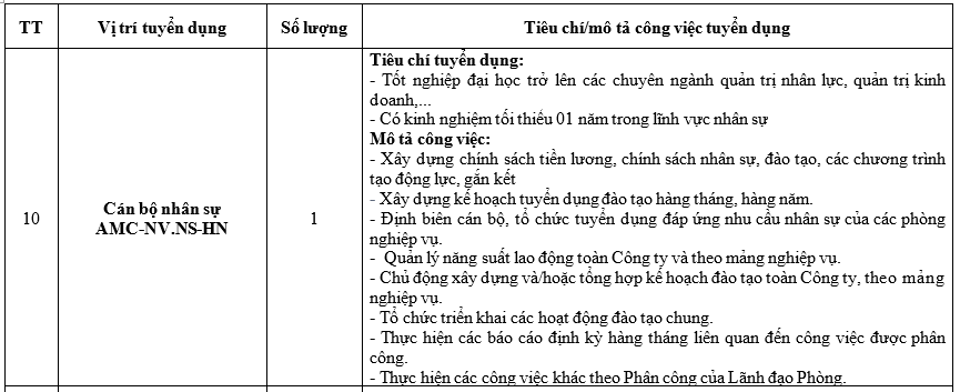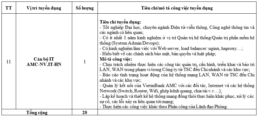 VietinBank AMC là Công ty con, 100% vốn của VietinBank AMC cần tuyển nhân sự làm việc tại Hà Nội: